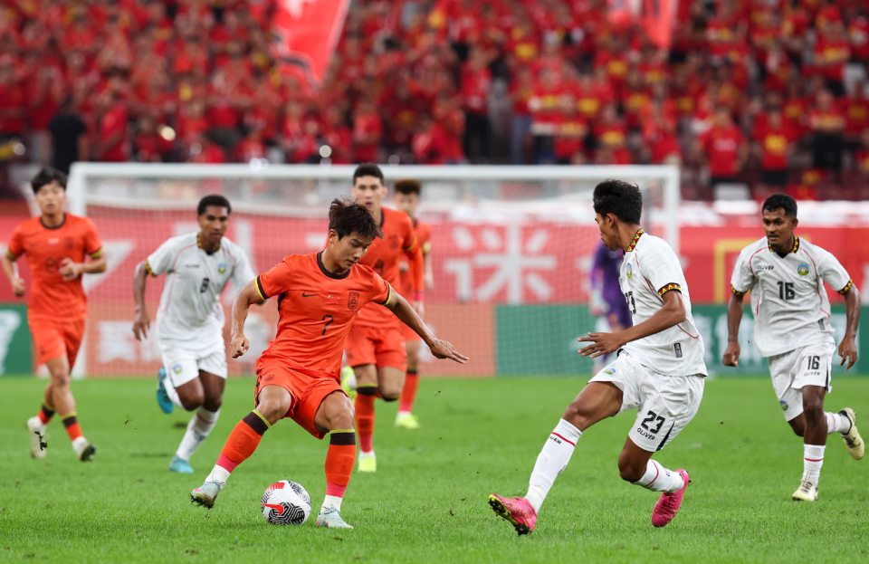 攻势更猛的国足,在第42分钟终于打破了场上的平衡,汪士钦右路主罚的定位球,造成东帝汶禁区一片混乱,后点的拜合拉木包抄建功,将比分改写为了1-0,半场结束之前,王钰栋贡献了一粒C罗式的进球,左路带球突破脚后跟一磕过掉防守球员,随后兜射打远角,帮助国足带着2球,回到了中场更衣室。